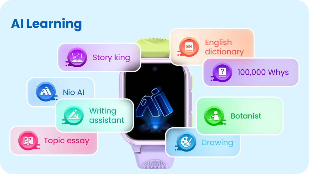 The built in AI assistant turns the watch into a powerful interactive learning tool. Drawing, poetry, writing, English dictionary and topic essay writing help. Access to the 100,000 why's, children encyclopaedia, science museum and history features. Academic assistance and math problem solver. All still being completely safe for children.