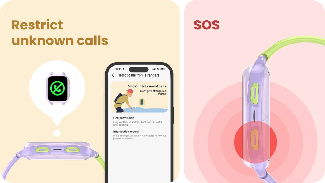 The watch is pre-programmed with contacts they can call so that the parent is in control. Make a voice call or a video call. The parent can send text messages and emojis to the watch from the app. The child can respond only by voice message or emoji. You cannot send and receive standard SMS messages to the watch. You must use the app to communicate. The children can only communicate with the contacts put into the watch from the app so messages can't be sent to the watch from strangers. Featuring a class mode set on the app, the home screen is locked and all incoming calls will be blocked.