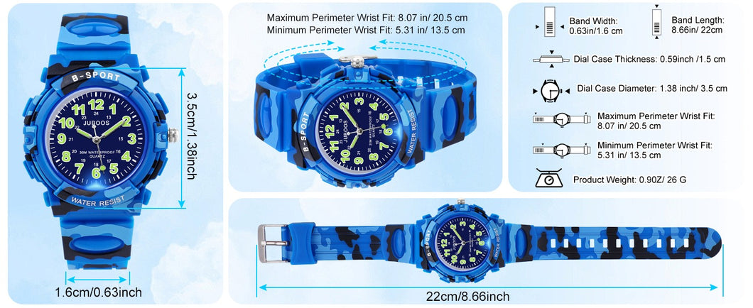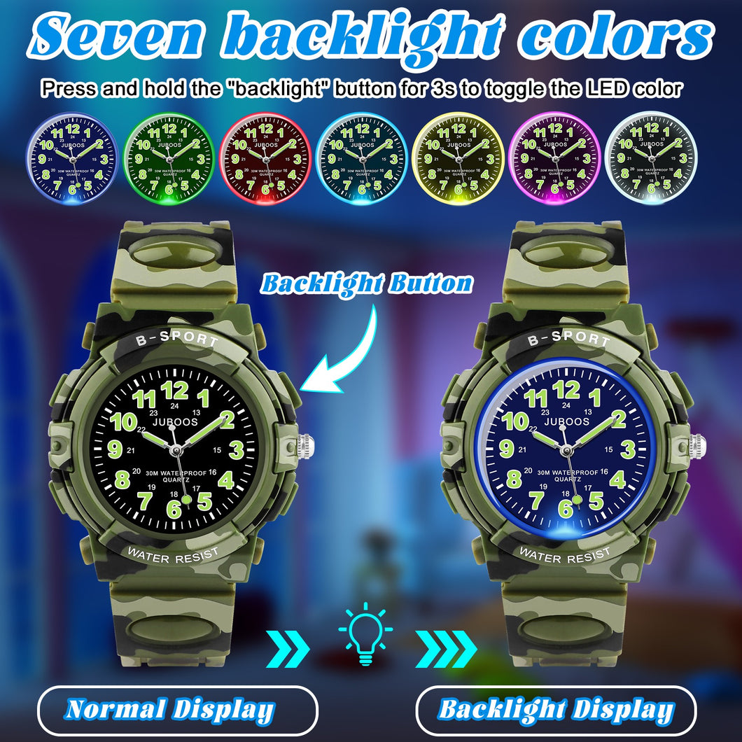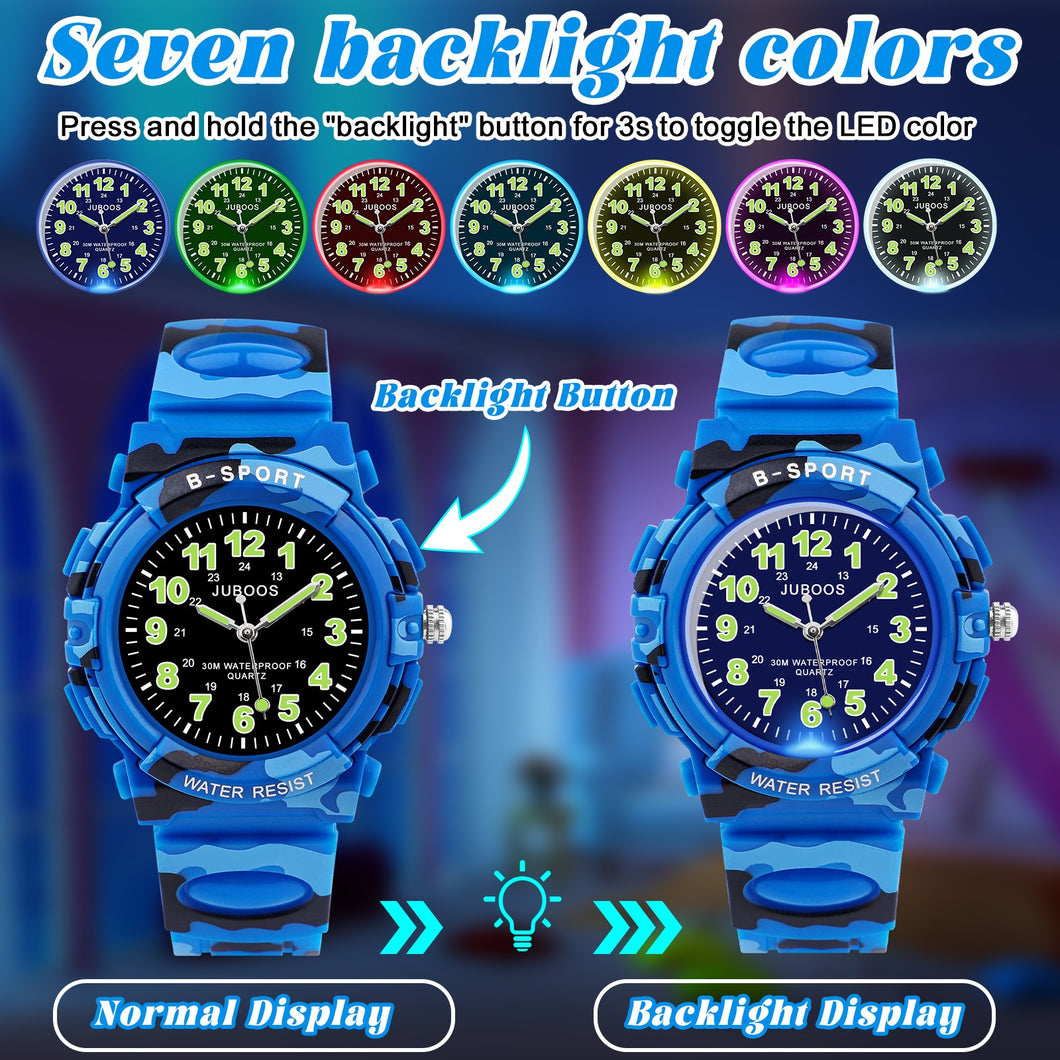 This analogue camo watch has 24 hour learning numbers to help learn and a cool multi coloured back light which looks really cool. The watch face size is not too big and not too small and we think it should fit most kids wrist sizes. Coming in two classic camouflage colours green and blue!