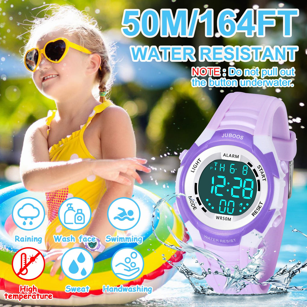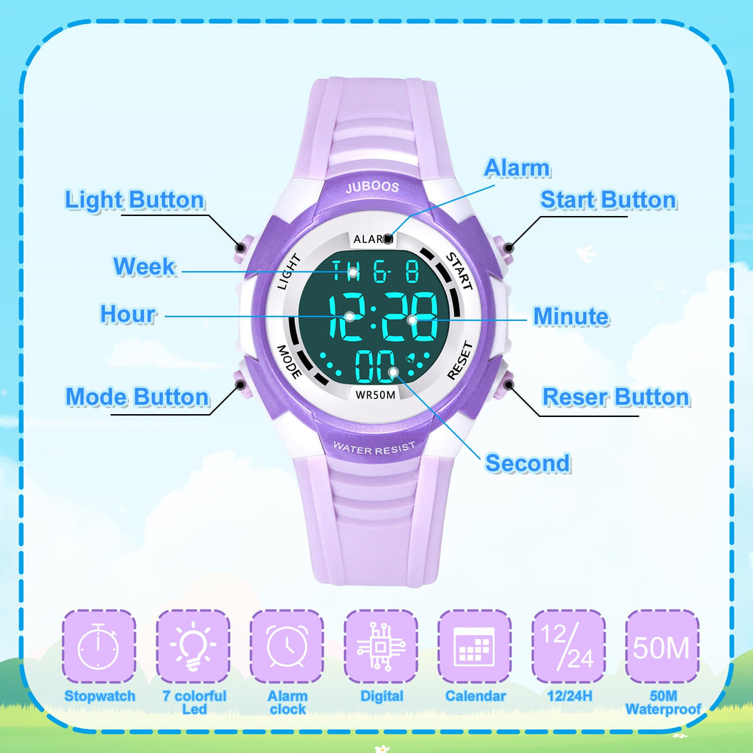 This classic light up girls digital watch has an easy to read digital display with the day, date and time all visible on the watch face. It has 7 different coloured lights to light up the watch at night which looks really cool. This watch has a nice soft strap that is a good comfortable fit on kids wrists. Coming in a really nice purple colour!
