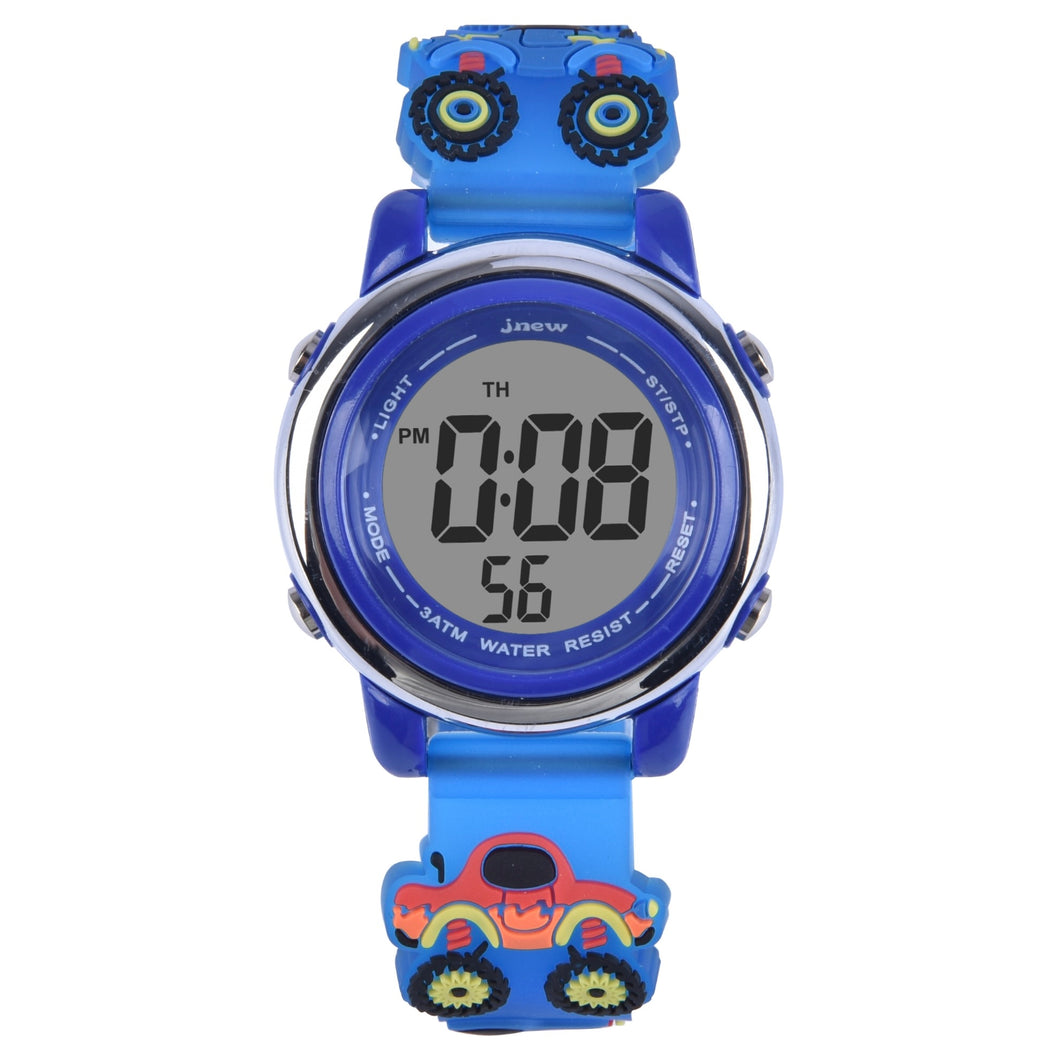 This is a monster truck themed light up digital watch with an easy to read large digital display. It has 7 different coloured lights to light up the watch at night which looks really cool. This watch has a smooth soft strap that fits really nicely. This pattern is popular for boys!